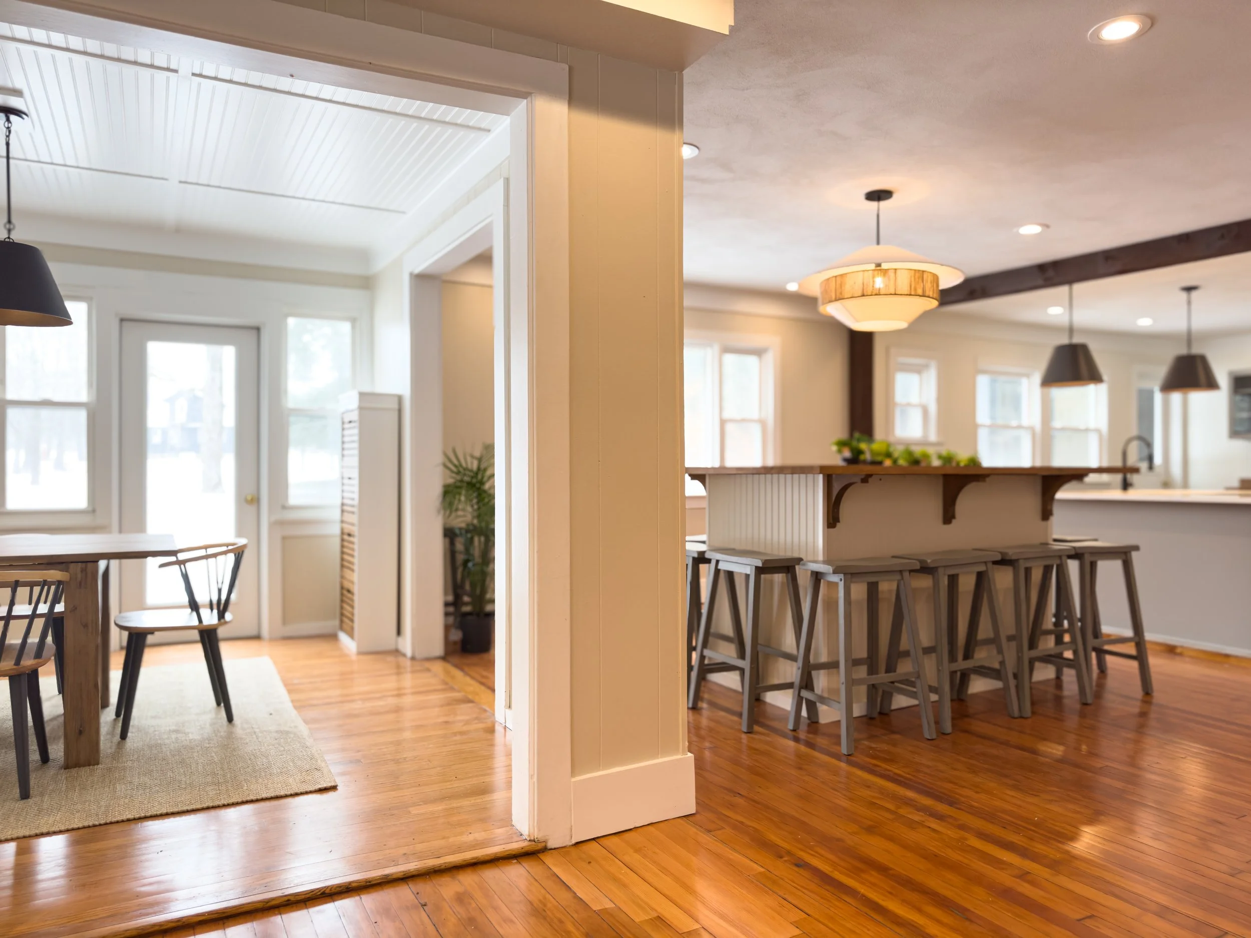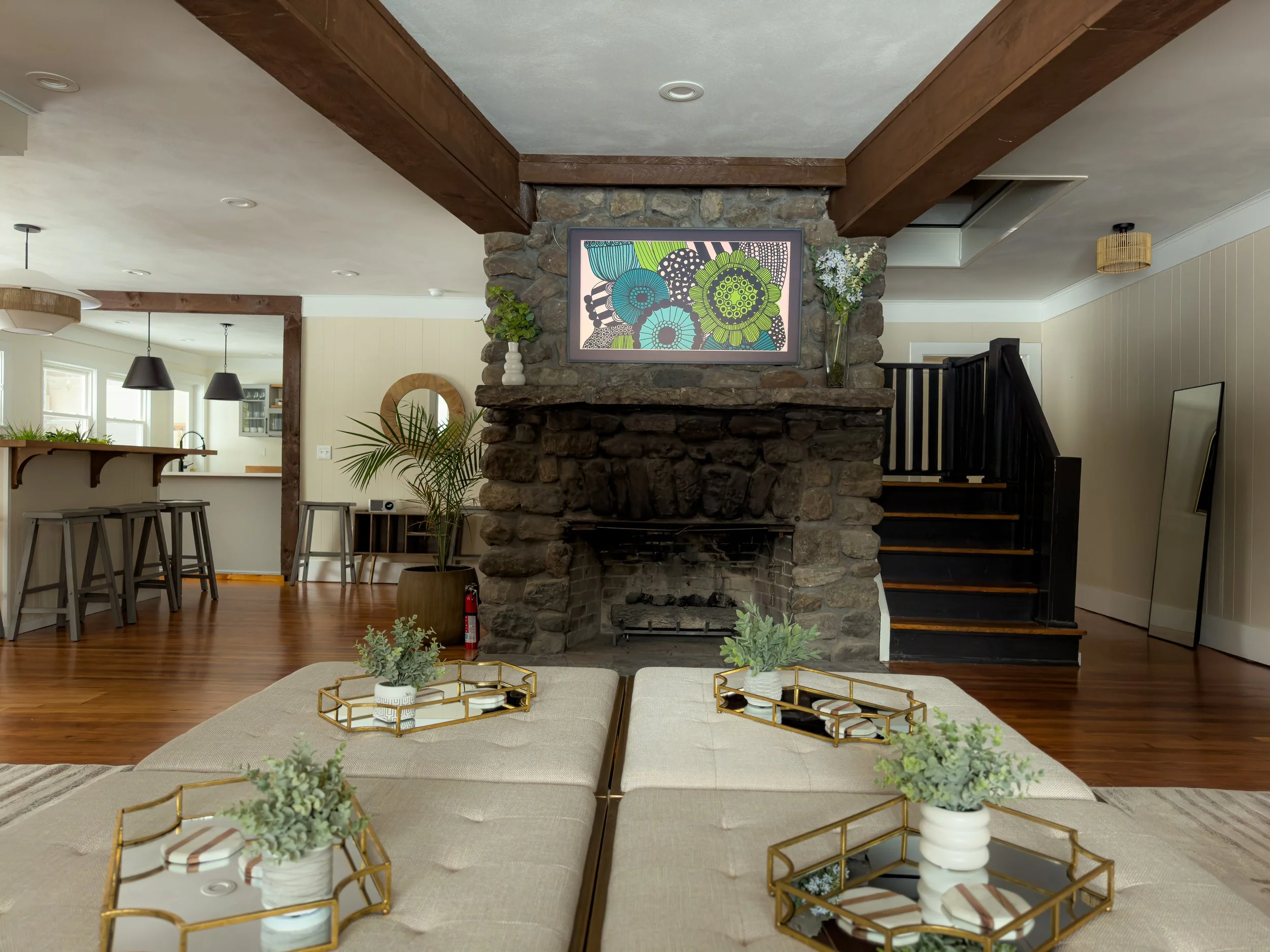Saunter into a world we intentionally crafted for relaxation and rejuvenation. We've curated an environment lush with convenience, but free from modern distractions, allowing you to truly unwind. Grace Manor's first floor beckons you to relax and comfortably connect. A large living room with ample seating and an inviting 100-year-old stone fireplace allows friends to gather for movies and conversations. Next to a shuffleboard table is our custom floating bar with seating for 12, a built in mini fridge and plantings carefully nestled under a woven jute and linen light. The kitchen offers everything you need to make a meal and plenty of custom storage space for all your food and snacks. Then feast in the massive dining area that seats 16+ people and enjoys views of the grounds.