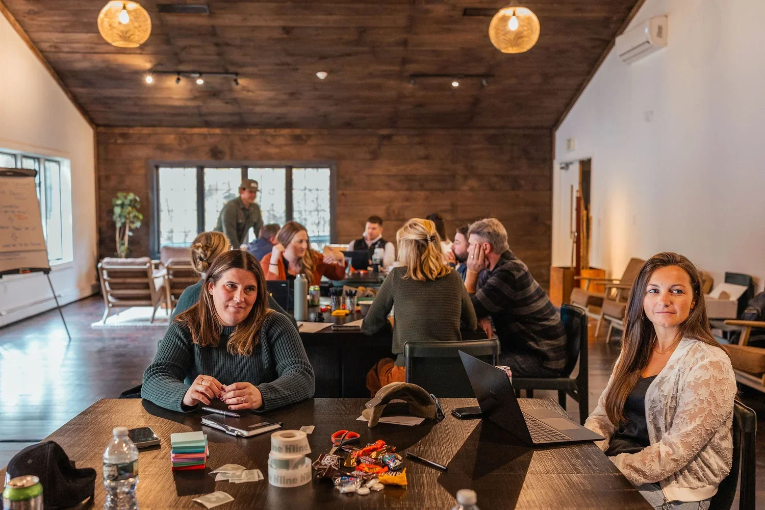Team members gather in a rustic meeting lodge at Vanderkamp, a corporate retreat venue near Syracuse NY, featuring natural wood interiors, a stone fireplace, and flexible workspaces for leadership sessions and team-building.